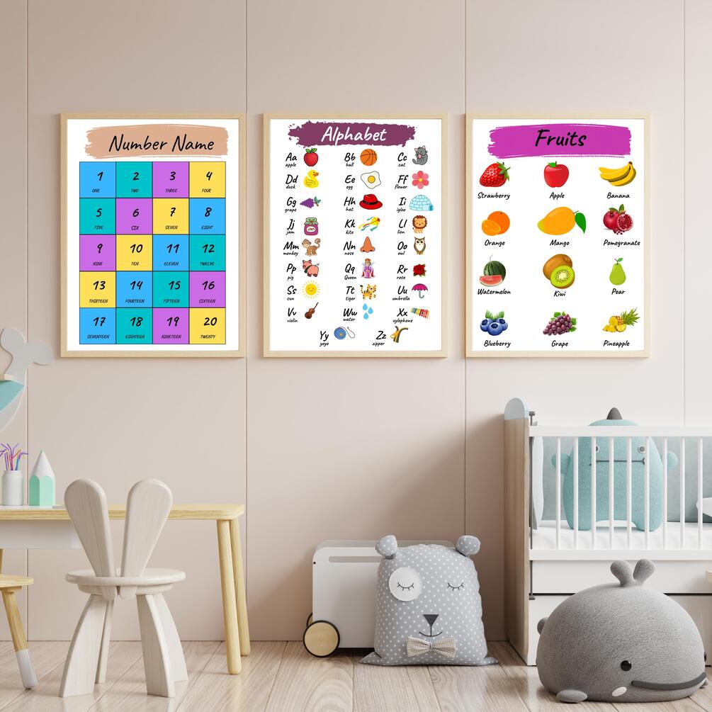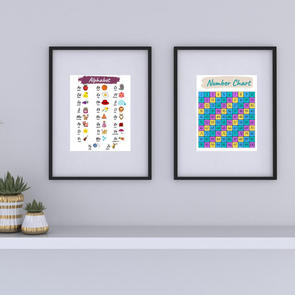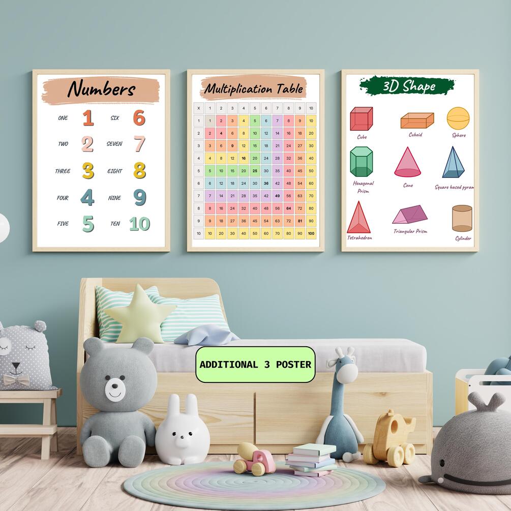 This comprehensive set includes posters for letters, numbers, multiplication tables (1-10), 2D shapes, colors, fruits names, days of the week, months of the year, seasons, weather, counting to 100, directions, feelings, and the solar system. Plus, an alternate set of three posters covers number names (1-10), multiplication tables (1-10), and 3D shapes.